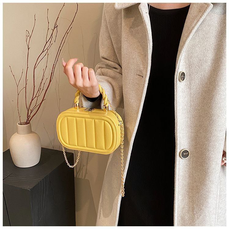 এক ঝলকে যে ব্যাগটি মুগ্ধ করে দেয়। আয়তাকার, ক্লিন-কাট সিলুয়েট, প্রিমিয়াম গ্লসি লেদারে তৈরি, যার প্রতিটি স্টিচ নিখুঁত। সামনে সোনালী টুইস্ট-লক ও ডি-রিং ক্লোজার ব্যাগটিকে দিয়েছে অসম্ভব রিফাইন্ড ও হাই-এন্ড ভাব।