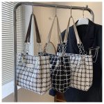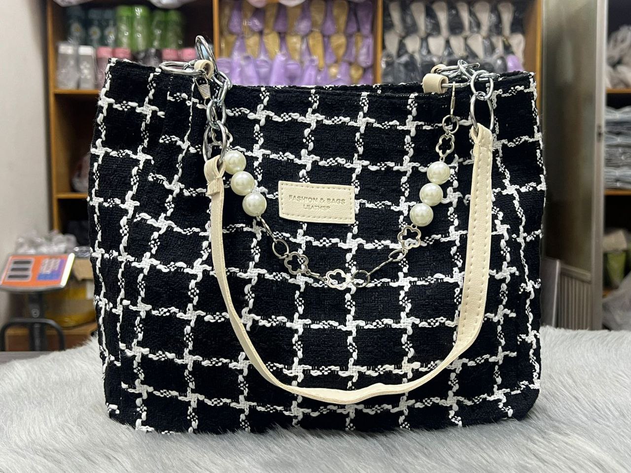ইংরেজিতে (যদি ফেসবুক/ইনস্টায় বিদেশি কাস্টমারও থাকে): Premium Quality Large Tote Bag in Classic Black & White Check/Grid Pattern. Features elegant pearl chain decoration with cream/off-white PU leather handles and silver-tone hardware. Chanel-inspired sophisticated look. Spacious interior with zipper pocket and small compartments. Perfect for office, college, shopping, or parties. Lightweight yet very sturdy. Approximate size: 35×30×12 cm. Trendy, classy and timeless design. Ready stock!