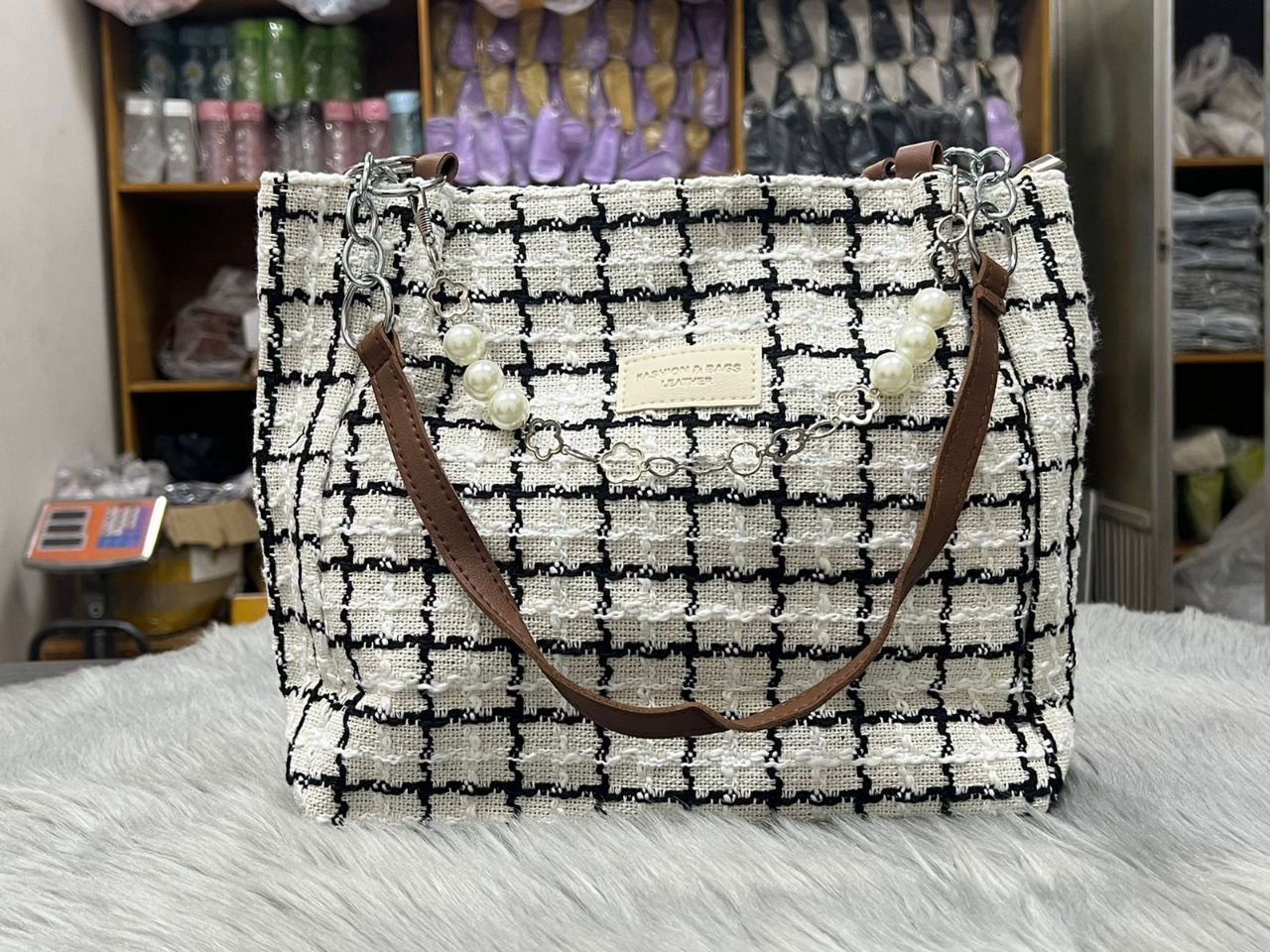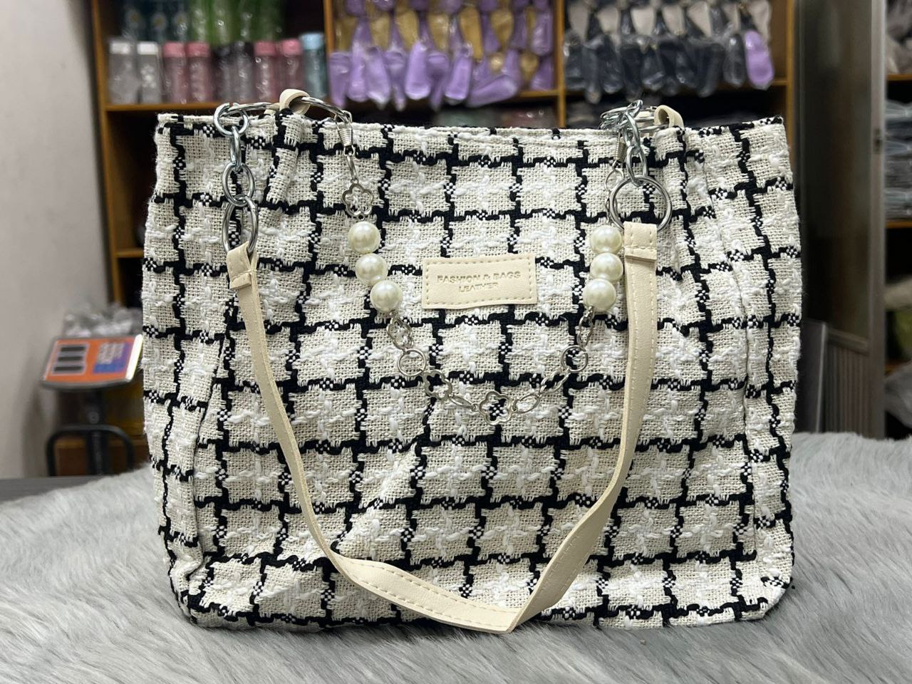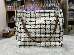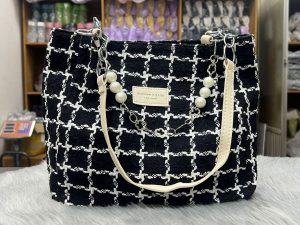 বাংলায়: প্রিমিয়াম কোয়ালিটির ব্ল্যাক-হোয়াইট চেক/গ্রিড প্যাটার্নের বড় সাইজের টোট ব্যাগ। উপরের অংশে সুন্দর পার্ল (মুক্তো) চেইন ও ক্রিম/অফ-হোয়াইট কালারের PU লেদার হ্যান্ডেল। ব্যাগের ফ্যাব্রিকের সাথে চেক ডিজাইন করা, যা একদম চ্যানেল স্টাইল লুক দেয়। ভেতরে প্রশস্ত স্পেস, জিপার পকেট ও ছোট পকেট আছে। দৈনিক ব্যবহার, অফিস, কলেজ, শপিং বা পার্টি – সব জায়গায় পারফেক্ট। হালকা ওজনের হলেও খুবই মজবুত। সাইজ: প্রায় ৩৫×৩০×১২ সেমি (বড় সাইজ)। একদম ট্রেন্ডি ও ক্লাসি লুক।